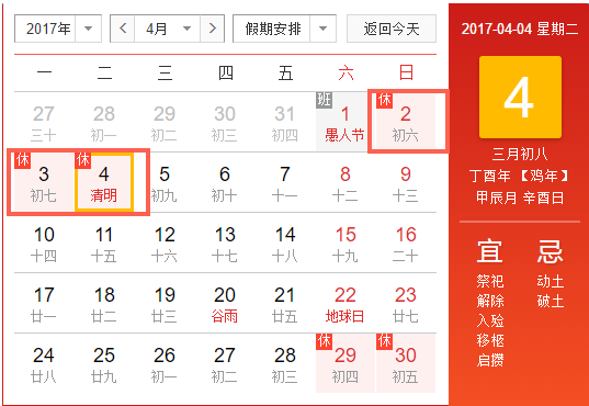 三、清明节:4月2日至4日放假调休,共3天。4月1日(星期六)上班。